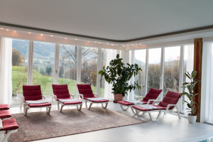 finnische Sauna, Dampfbad, Tepidarium, Solarium, Ruheliegen.