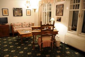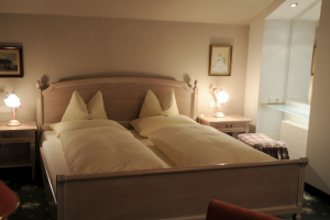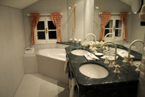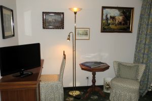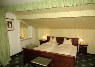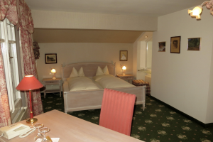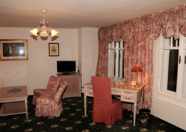 Geräumige Familien-Suite, 35m², Vorzimmer-Garderobe, kuschelige Schlafecke, großzügige Sitz-Gruppe mit ausziehbare Couch (2 Personen), Schreibtisch, TV, begehbare Schrank-Garderobe. Bad: Doppelwaschtisch, Badewanne, Dusche, getrenntes WC, Blick über Ennstal, nordseitigen Garten und Wiesen